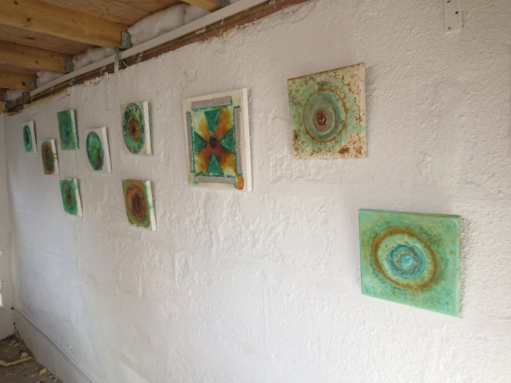 Over the last few weeks I have been transforming my outdoor studio into a small gallery space and hanging the newly created collection of ‘electrochemical paintings’.