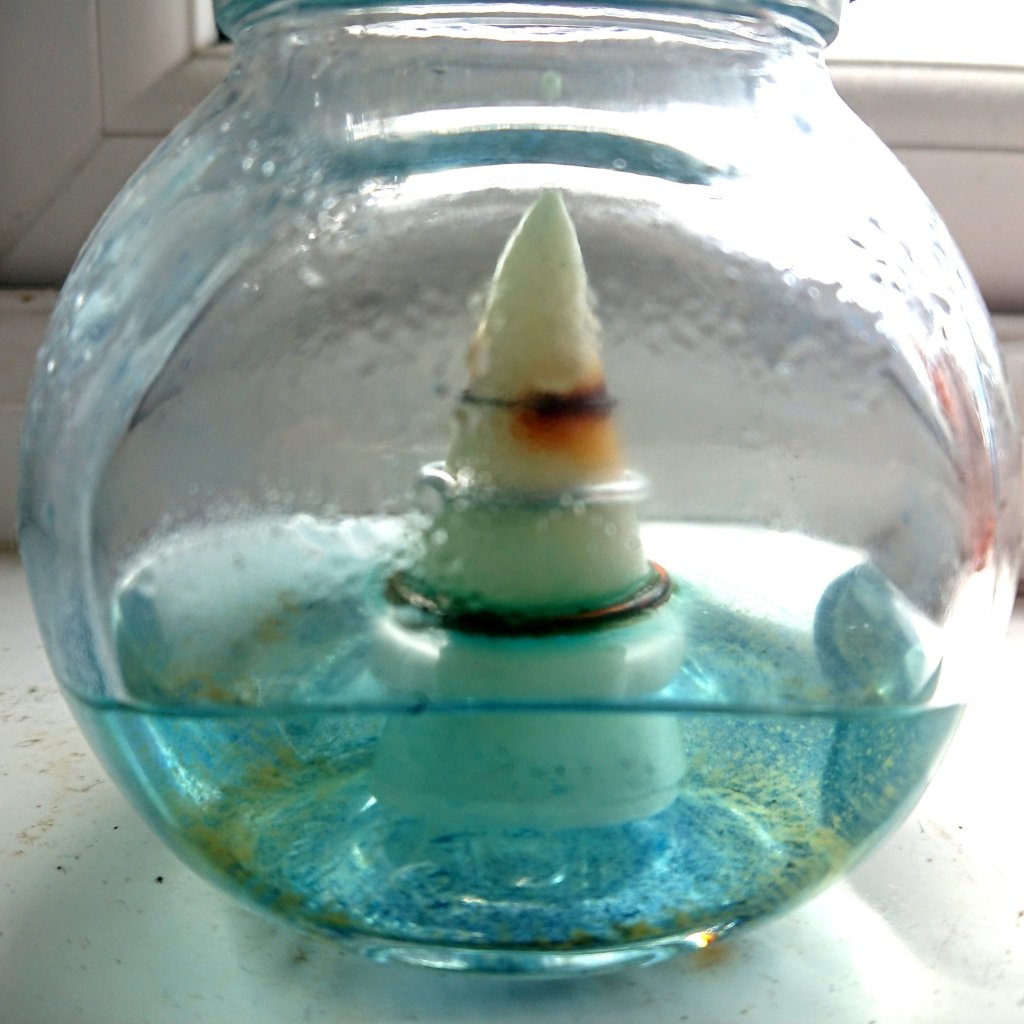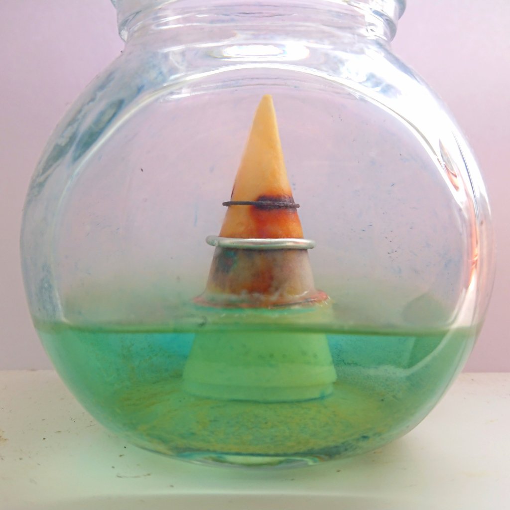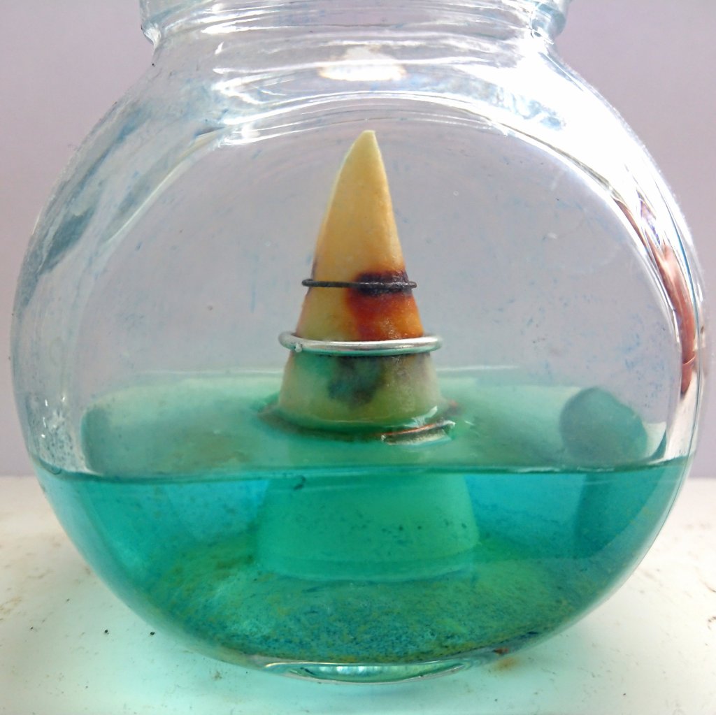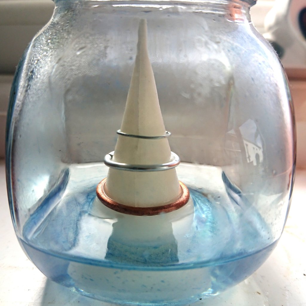 In order to forsee what might emerge I created a small conic construction of filter paper and the three rings of iron aluminium and copper. This was placed in a jar containing a solution of MgSO4 and a dash of Prussian Blue.