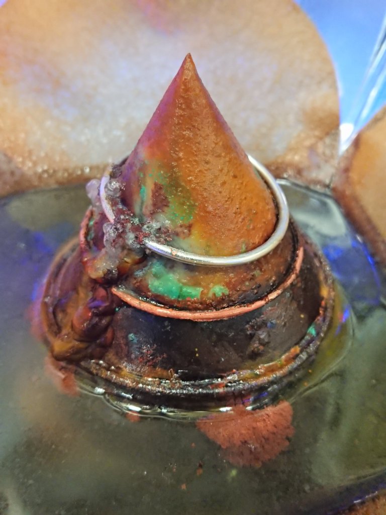 A few days later the electrochemical reactions were evident with the both iron and coppper rings giving forth telltale colourful decompositions: